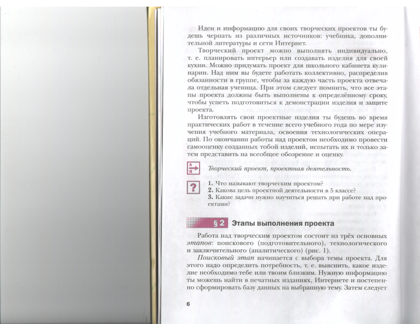 и уже умеете делать проекты. Первый проект по технологии мы и начнем делать на предстоящем уроке. Поэтому, чтобы освежить знания полученные ранее по этой теме, я прошу вас пройти по ссылкам и прочитать параграф №1 учебника "Что такое творческие проекты":