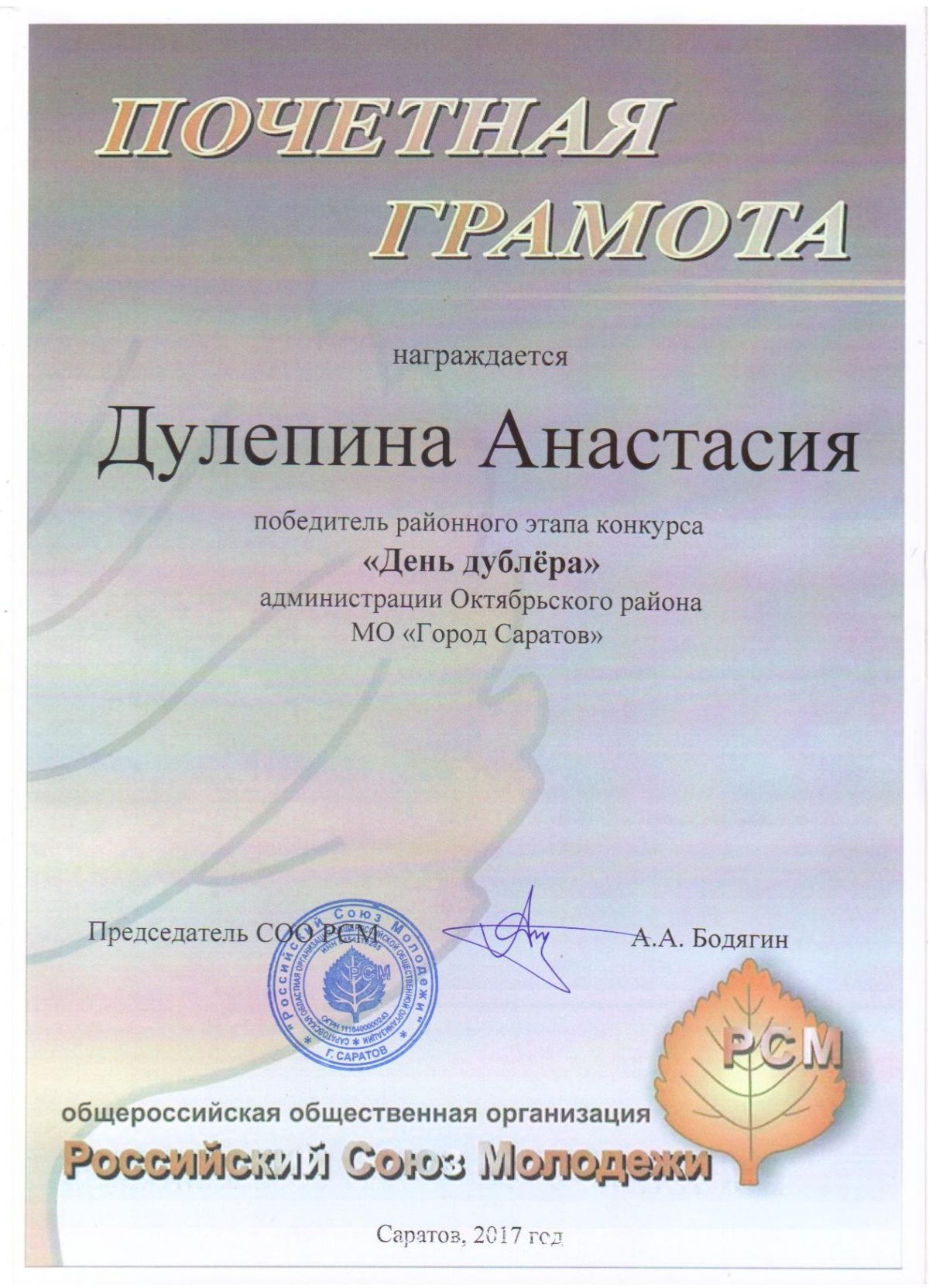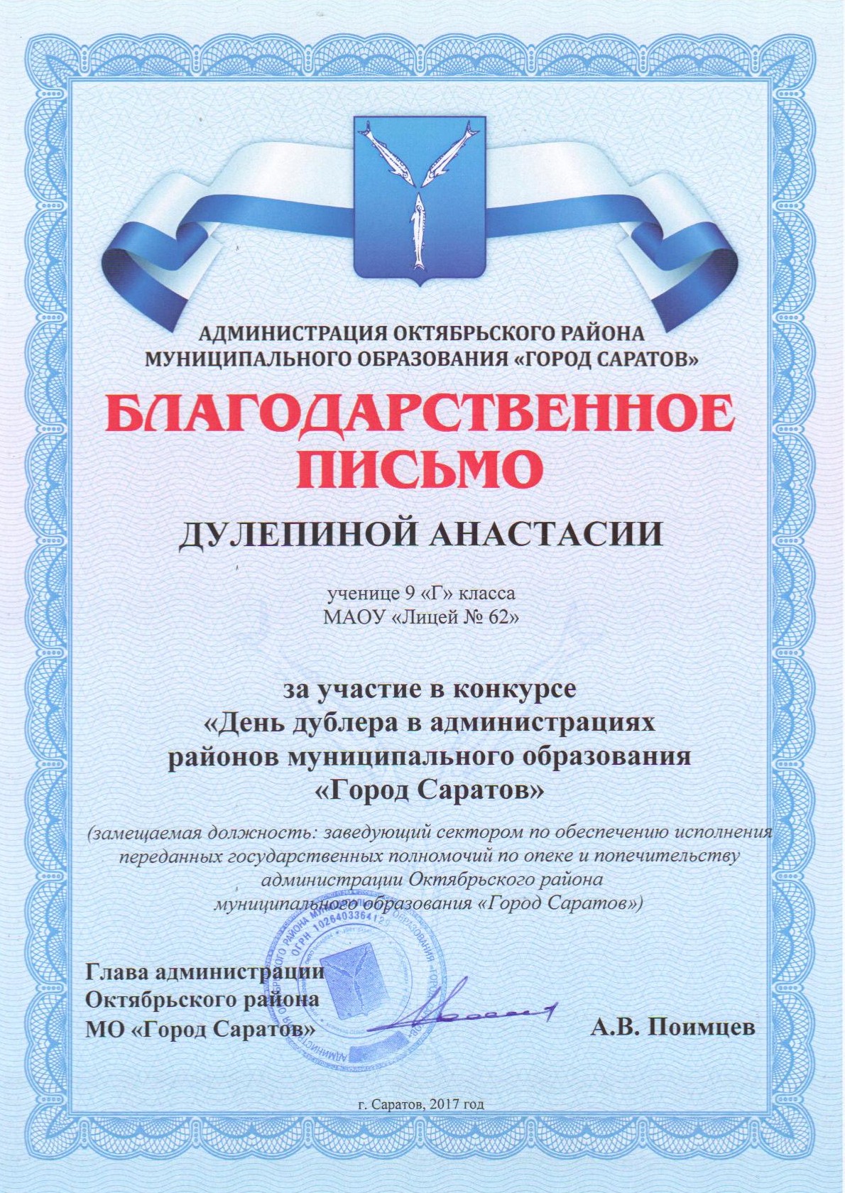 В финальной части "Дня дублера" приняли участие Платонова Мария, 9А класс, Дулепина Анастасия, 9Г класс, Яковлева Эвелина, 9Г класс. Они награждены Почетными грамотами победителей районного этапа конкурса "День дублера" администрации Октябрьского района МО "Город Саратов" и Благодарственными письмами за участие.