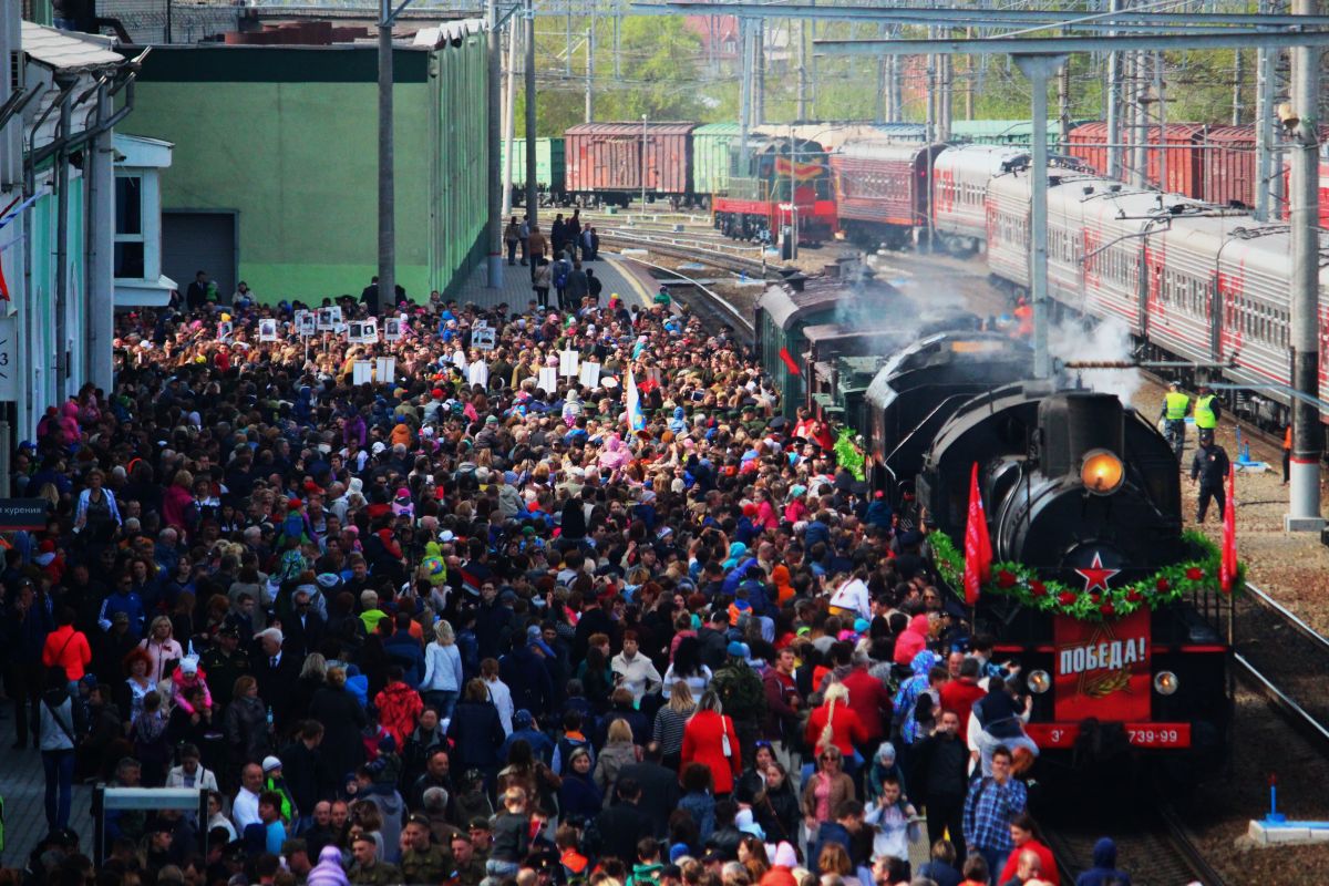 Поезд "Победа" сформирован из вагонов времен Великой Отечественной войны. Поезд ведут два паровоза, один из которых принимал участие в Сталинградской битве. В составе есть крытые товарные вагоны-теплушки, платформы для перевозки военной техники, салон-вагон.