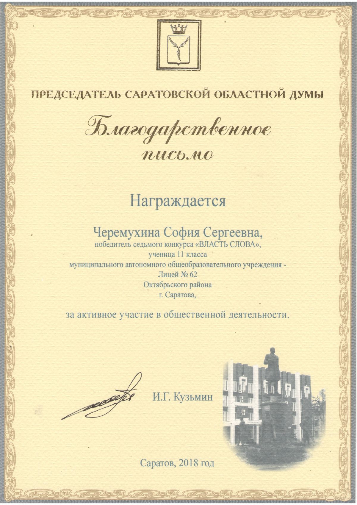 Черёмухина София участвовала в конкурсе «Журналистский дебют» и стала обладателем Гран – при и благодарственного письма от Саратовской областной Думы.