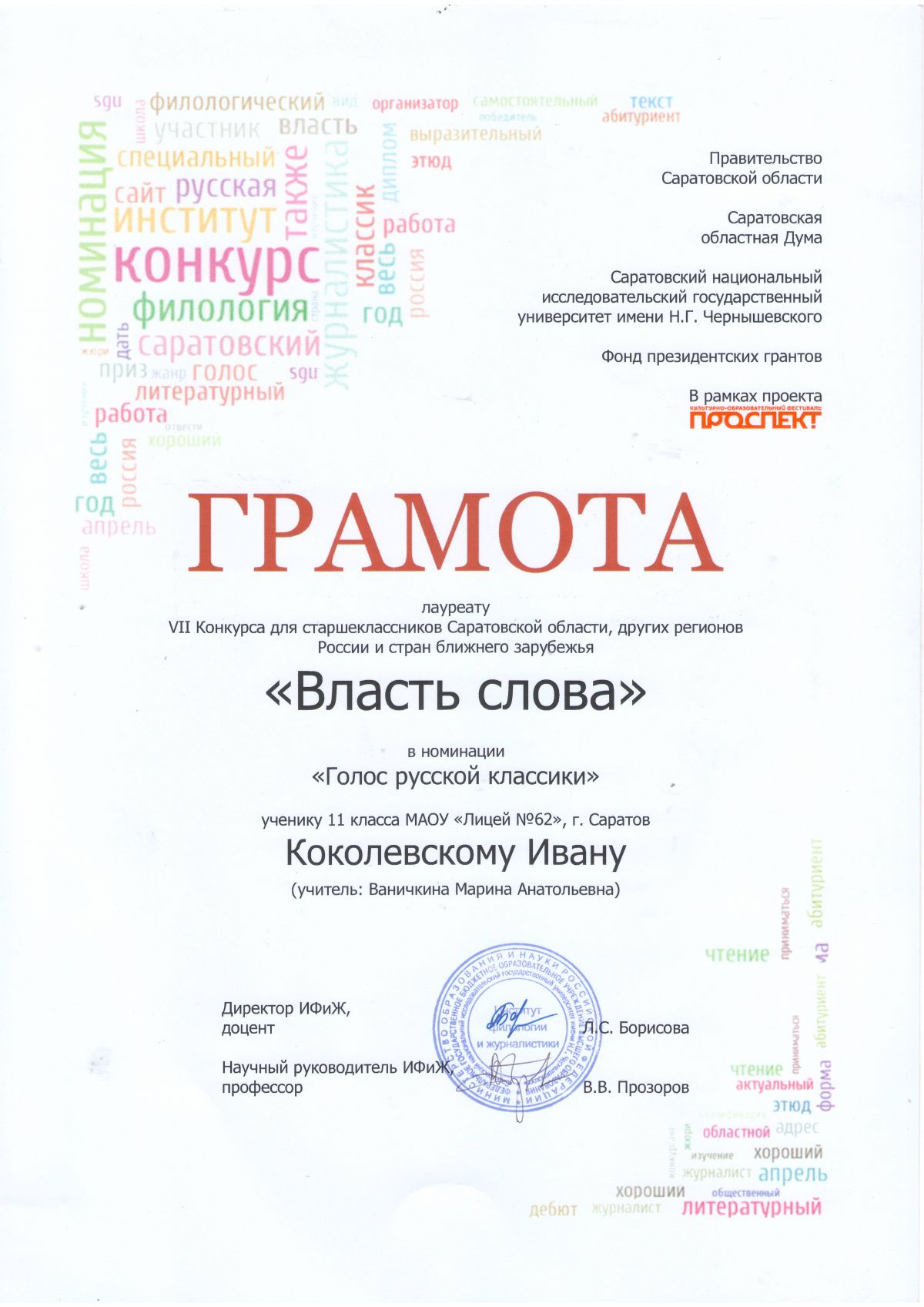 Конкурс для старшеклассников "Власть слова" проводится под патронатом губернатора Валерия Радаева при поддержке облдумы уже седьмой раз. В этом году в нём приняли участие два наших выпускника: Черёмухина София, ученица 11 «А» класса, и Коколевский Иван, ученик 11 «Б» класса.