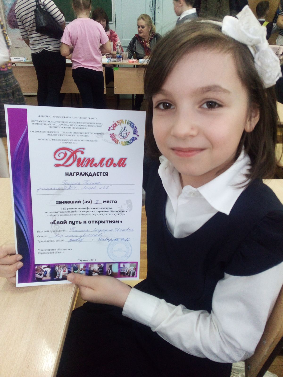 Ученица 3 «В» класса Грозина Полина заняла второе место в IХ Региональном фестивале-конкурсе исследовательских работ и творческих проектов «Свой путь к открытиям» в секции «Мир моих увлечений». Фестиваль-конкурс прошел 29 марта 2019 года в МОУ «ГИМНАЗИЯ №34» Заводского района г. Саратова. В состав жюри фестиваля-конкурса были приглашены представители саратовских вузов, телерадиокомпаний, специалисты кафедр ГАУ ДПО «СОИРО», ведущие сотрудники саратовских музеев.