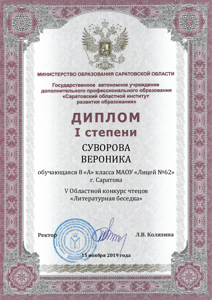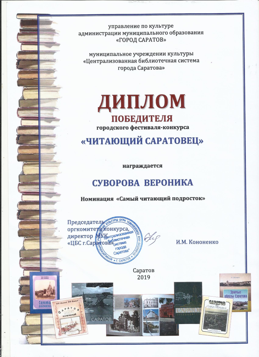 27 ноября 2019 года Суворова Вероники стала победителем в номинации «Самый читающий подросток» городского фестиваля-конкурса «Читающий саратовец».