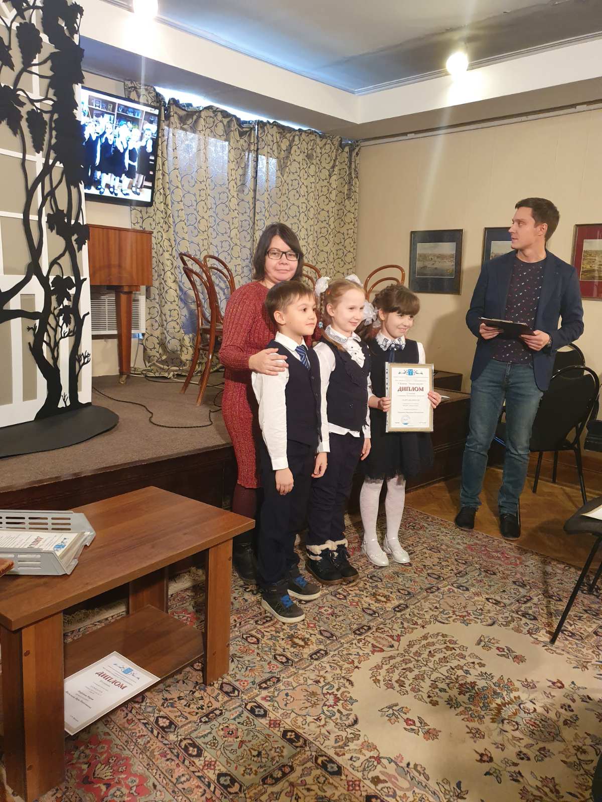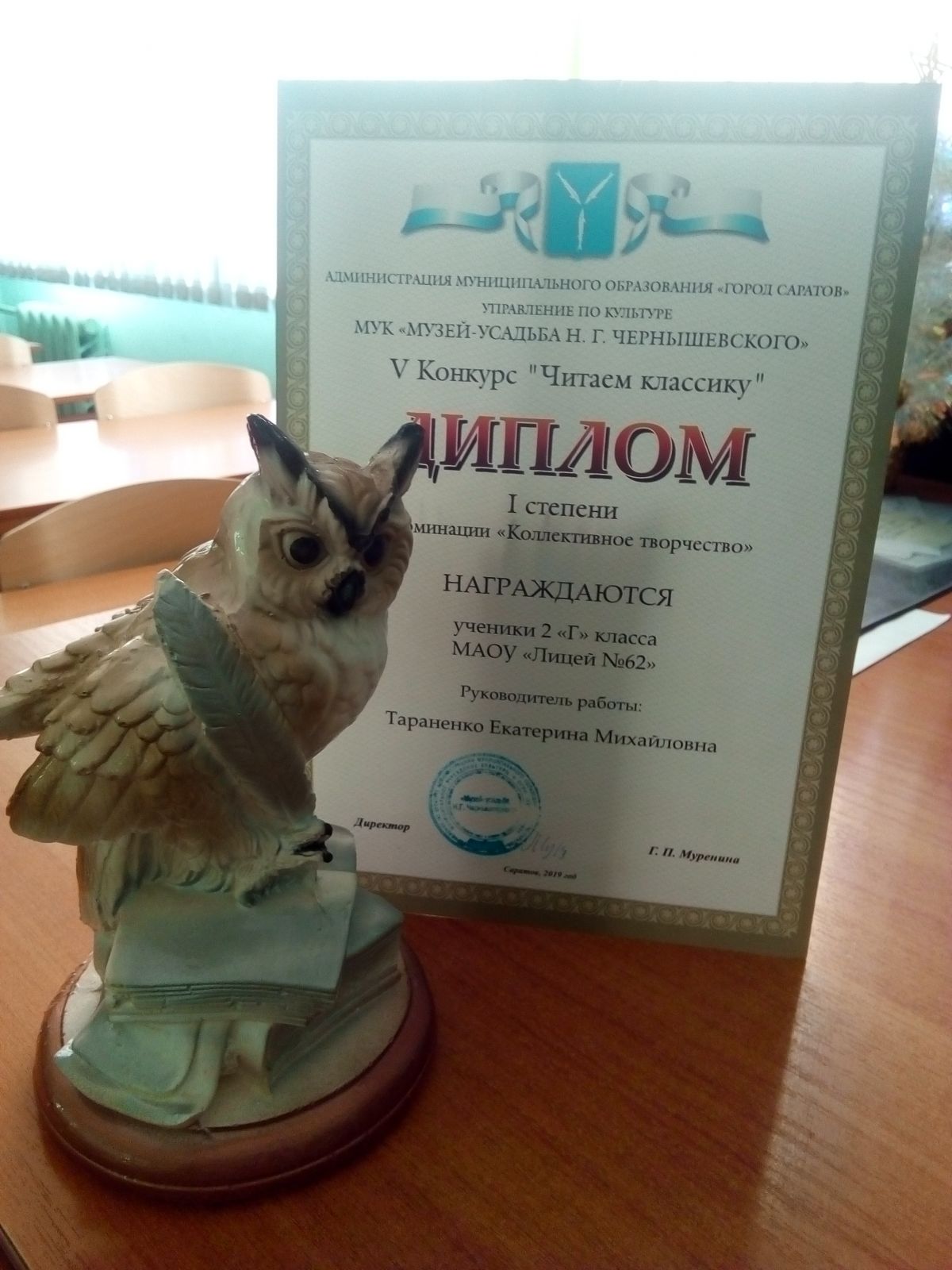 20 декабря в музее-усадьбе Н.Г.Чернышевского прошло награждение победителей конкурса "Читаем классику". Команда 2 "Г" класса (классный руководитель Тараненко Е.М.) стала победителем в номинации "Коллективное творчество" и получила диплом I степени и памятный подарок - копилку мудрости - Сову.
