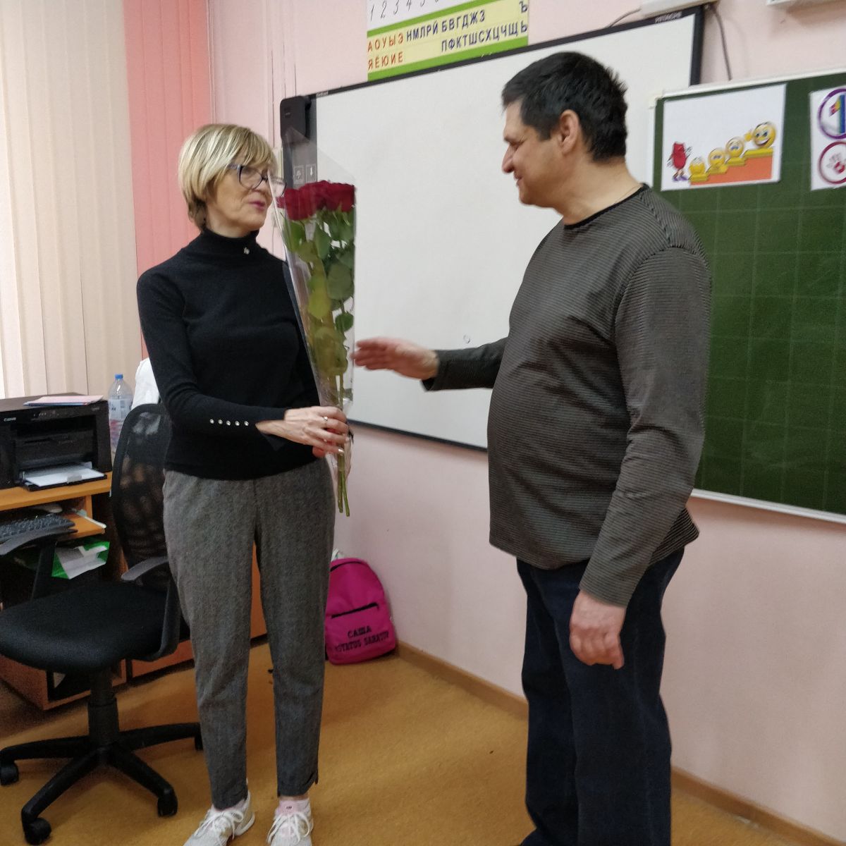 В конце беседы ученики 1 "Д" класса (кл.руководитель Зотова Л.Н.) подарили гостю цветы и буквально засыпали его вопросами. Почему памятник "Журавли" был установлен именно на Соколовой горе? Как на монумент крепили золотую звезду? Куда летят саратовские Журавли? Об этом и многом другом спрашивали первоклассники.
