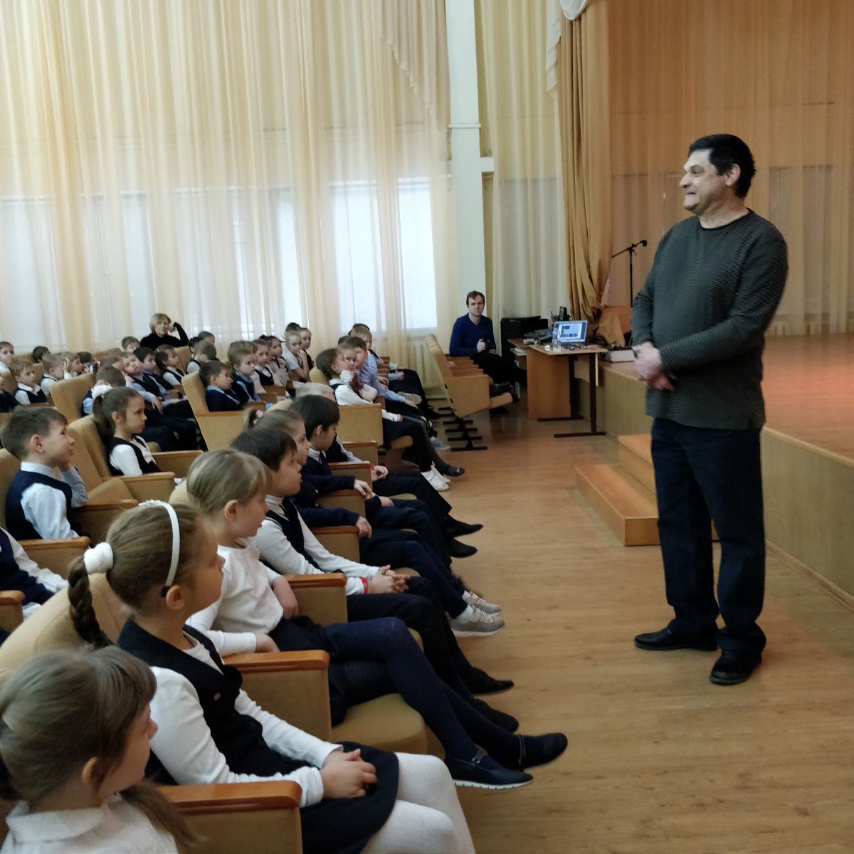 Ученики первых классов с интересом слушали рассказ о жизни и творчестве его отца, известного архитектора Ю.И.Менякина.