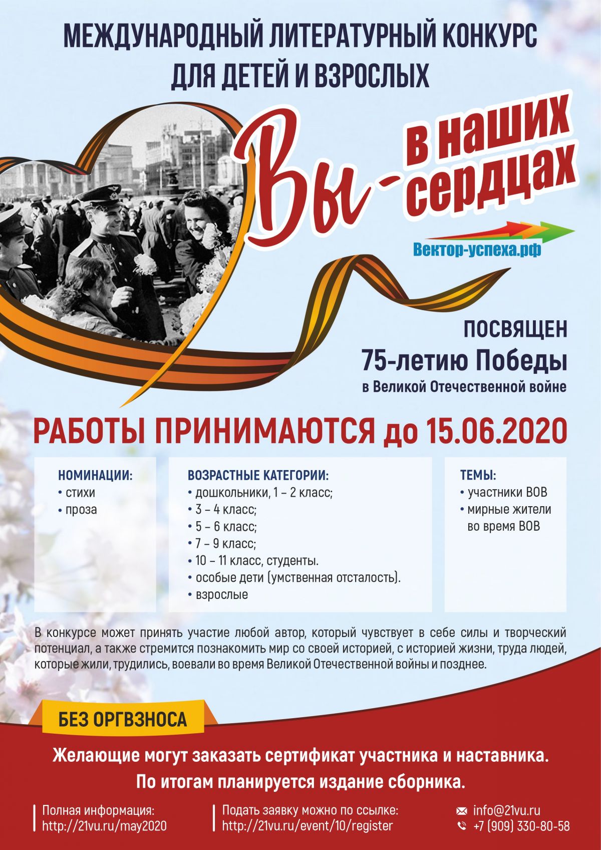 Открыт прием стихов и прозы от взрослых и детей на литературный конкурс "Вы — в наших сердцах". Это литературный "Бессмертный полк", ведь мы можем не только показать фото своего героя, но и рассказать о нем, рассказать о его жизни, труде, подвиге.