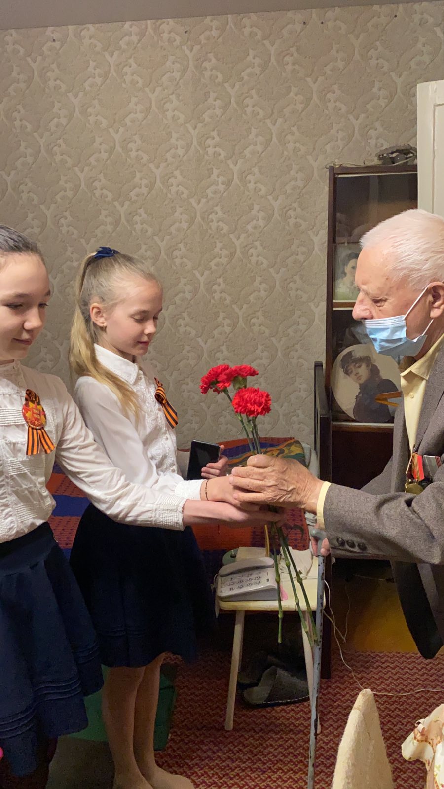 Опубликовано: 8 мая 2021, 22:34Из поколения в поколение важно передавать память о героях войны. Ученицам 5В класса удалось лично встретиться с ветераном войны. Девочки поздравили с днем Победы Бурина Виктора Ильича: прочитали стихи, вручили цветы и памятную открытку.